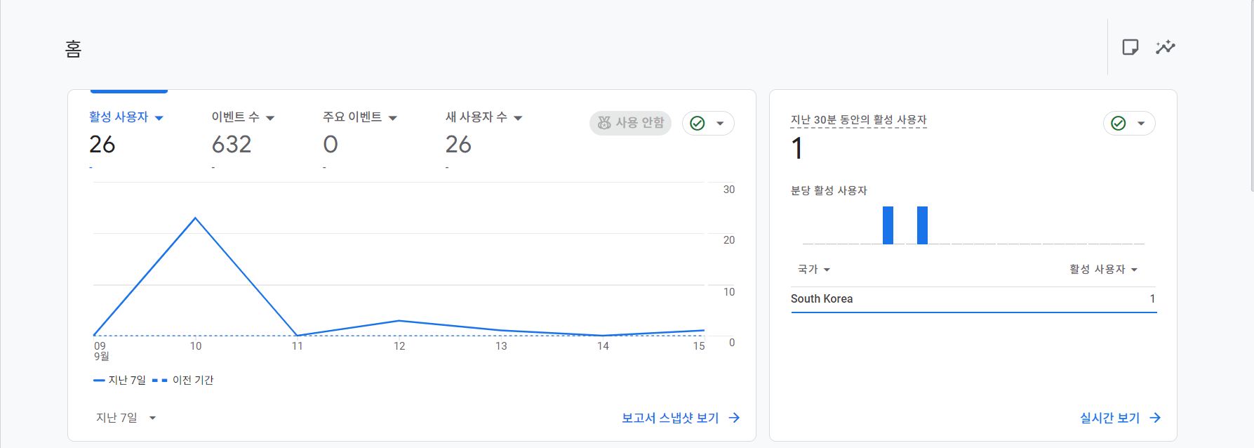 GA4 코드만 사용할 때는 대시보드가 정상적으로 작동하지만, GTM을 설치한 직후에는 실시간 데이터가 며칠간 보이지 않는 오류가 있습니다. 보통 약 48시간 정도 지나면 정상 작동하니, Google Tag Assistant로 코드 설치 여부만 확인되면 걱정하지 않으셔도 됩니다.