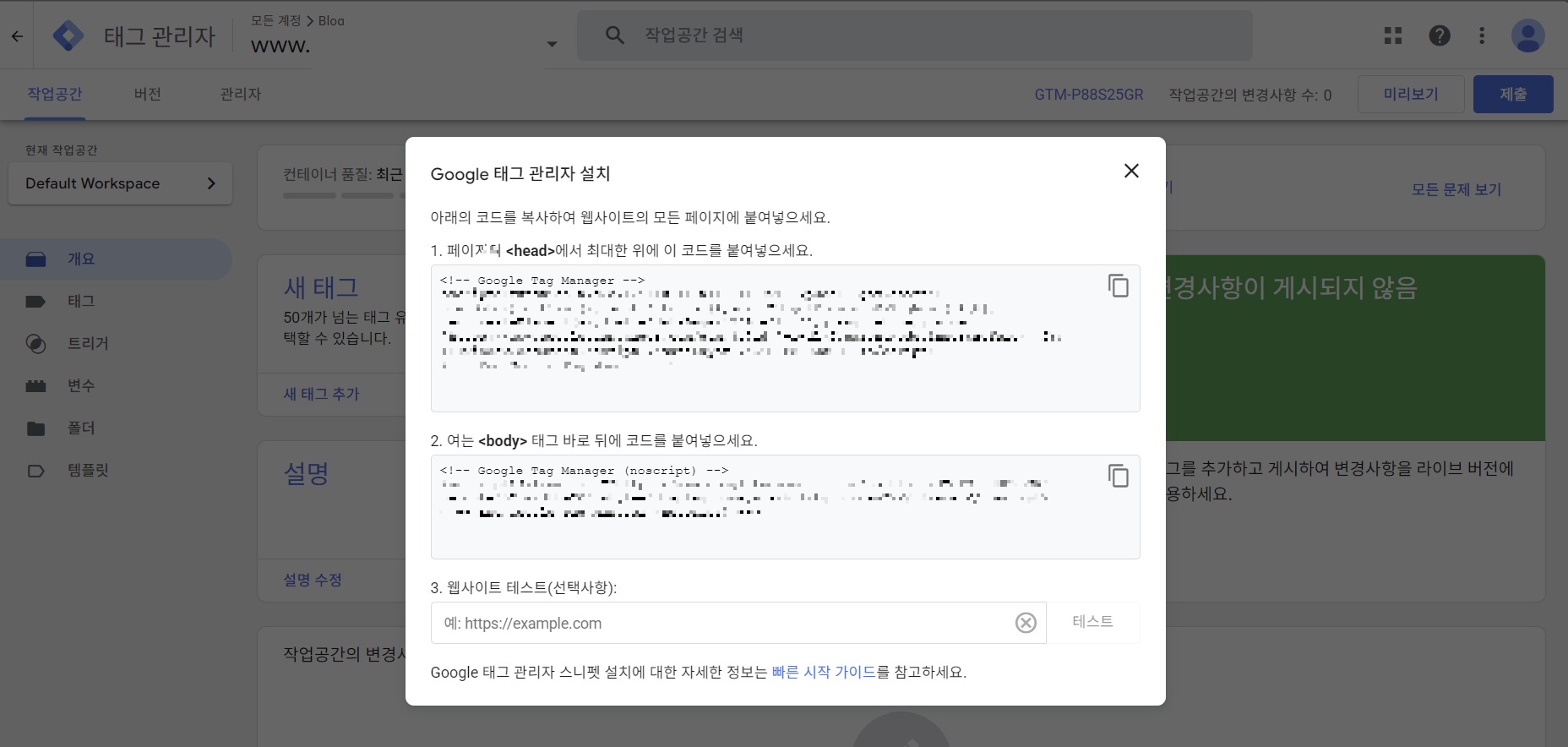 이용약관 동의해주시면 Google 태그 관리자 설치 화면이 나오며 GA4 코드를 티스토리 HTML에 심었던 것과 비슷한 코드가 나타납니다.