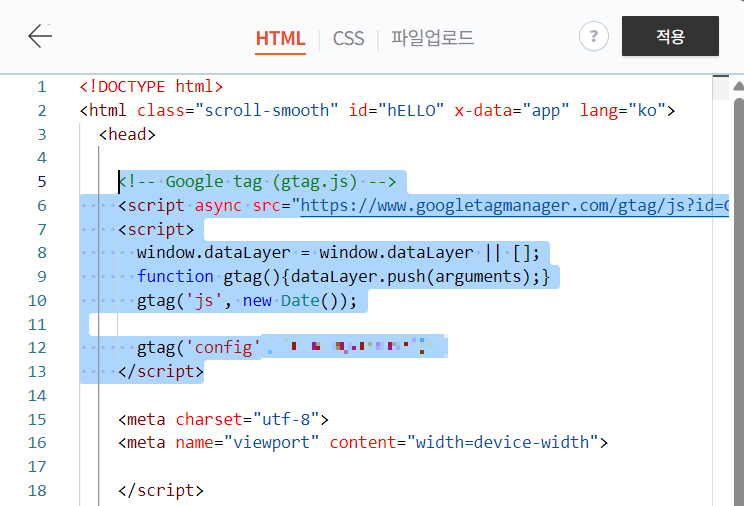 위치는 GA4 코드를 설치했던 것과 동일하게 가장 위에 설치하면 됩니다.
