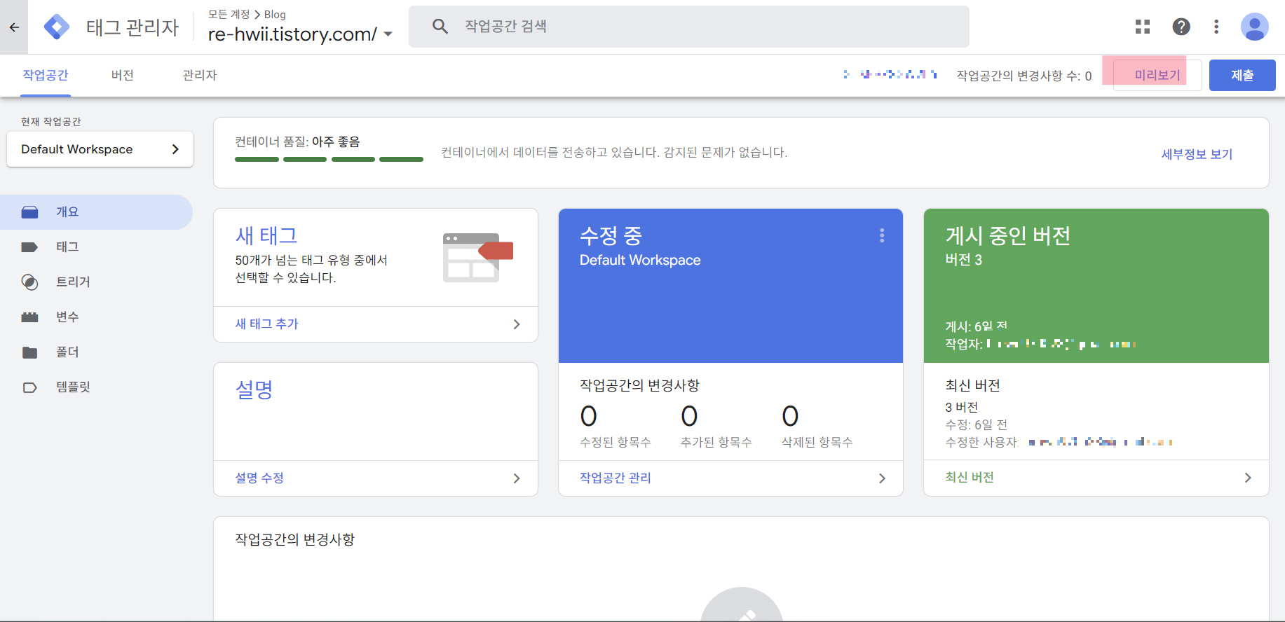 GTM 코드와 태그가 잘 만들어졌다면, 미리보기 버튼을 클릭하여 잘 작동하는지 확인할 수 있습니다.